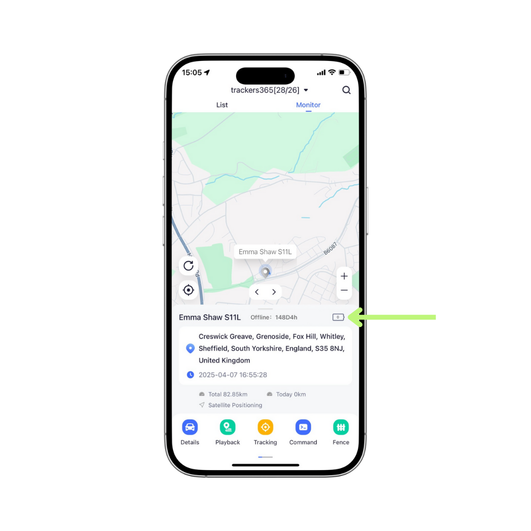 If your GPS tracker is static or inactive for an extended period of time (such as in the home) it will switch to Static Mode, then Offline Mode to save battery (shown by a grey icon, rather than blue- see green arrow).