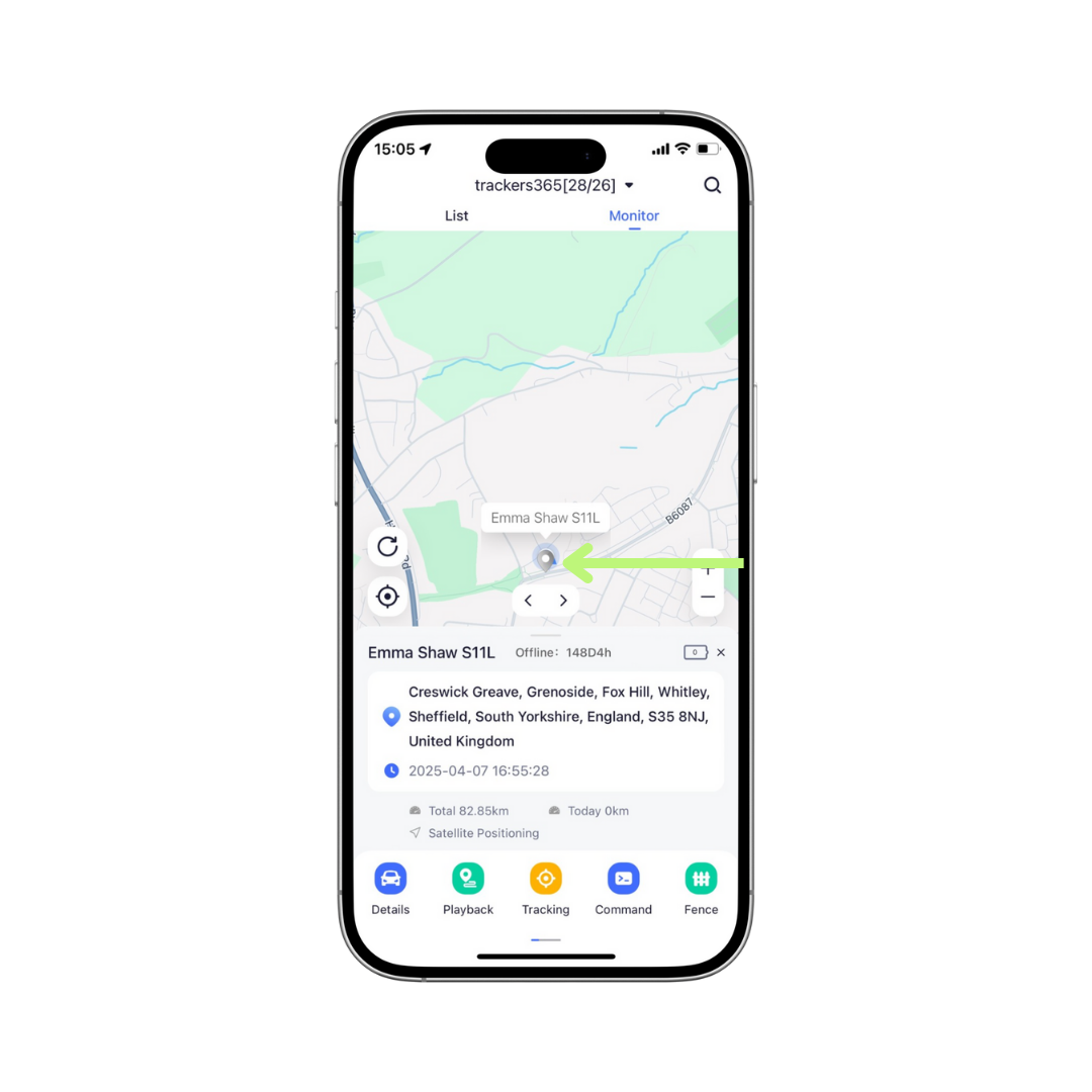 Opening the WhatGPS app will bring up your GPS tracker's map and details.